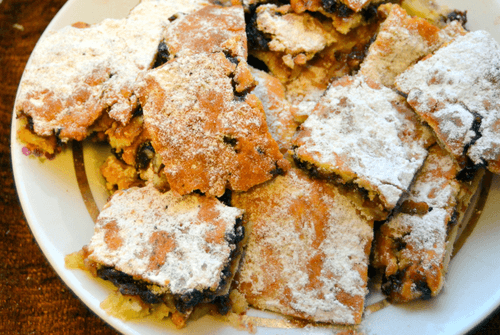 Remove from the oven, cut into small squares, place on a plate, and sprinkle with powdered sugar on top.