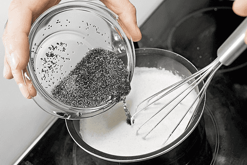 Add poppy seeds soaked in boiling water for 20-30 minutes to the cream. Cook for about ten minutes, stirring the cream and shaking the pot. Add about a tablespoon of sugar and a pinch of salt. Then add semolina and cook until fully done, then blend with an immersion blender and let cool.