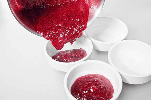 Slightly cool the raspberries, then pour the resulting jelly into small molds, filling each one a third full. The jelly should be thick enough that a spoon does not sink in it. Place the molds with raspberries in the refrigerator for 15 minutes.