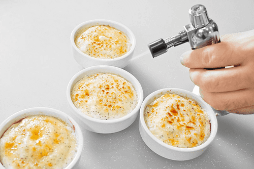 Carefully torch each portion of raspberry semolina pudding until a beautiful golden and firm caramel crust forms, like classic crème brûlée.