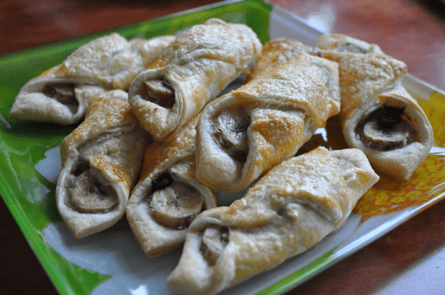 Place half a banana in the center and wrap it in dough like an 'envelope'.