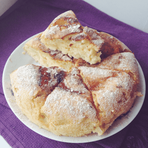 Pour the batter over the apples. Set to bake for 40 minutes. When ready, flip onto a serving dish.