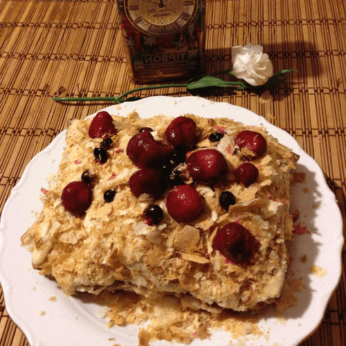 The 'Napoleon' cake with fresh strawberries and Baileys liqueur is an exquisite combination of puff pastry, delicate custard, and fragrant strawberries infused with hints of vanilla and Irish liqueur. The history of 'Napoleon' dates back to the 19th century when its popularity spread across Europe, but this version offers a modern twist on the classic recipe. Airy layers soaked in cream and chocolate create a multi-layered texture, while fresh strawberries add a refreshing sweetness to the dessert. Topped with crumbs and berries, the cake is perfect for celebrations and special occasions, impressing with its harmonious flavor and refined appearance. It is a true culinary masterpiece that delights the eye and provides unforgettable gastronomic experiences.