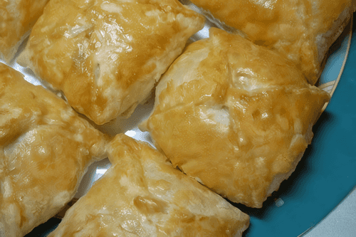 Place the filling on the dough and pinch it into an envelope shape. Arrange the finished envelopes on a greased pan or baking sheet and bake in the oven. The dish will be ready in about 25-30 minutes.