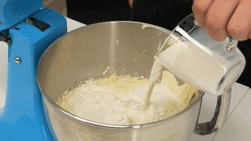 Place the remaining butter in a large bowl and add a cup of sugar. Beat with a mixer for one minute, add the eggs one at a time, then mix in the flour mixture and pour in the milk.