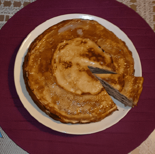 Layer the pancakes in the mold and brush them with the sauce made from grape juice. Completely coat the top of the cake with the sauce, or if a small pancake was made from leftover batter during baking, place it on top of the fully coated pancake and brush only it with sunflower oil.