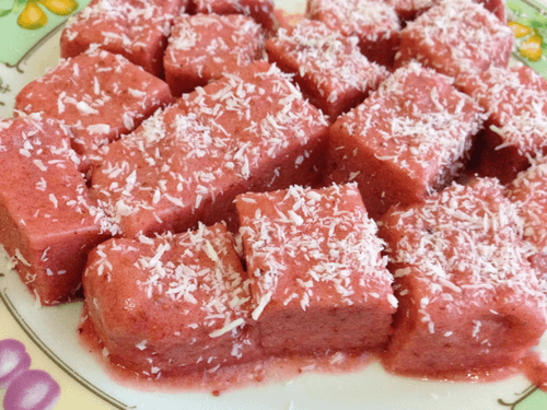 Pour the strawberry puree into a mold and place it in the refrigerator until set, then remove the soufflé from the mold and cut it into cubes.