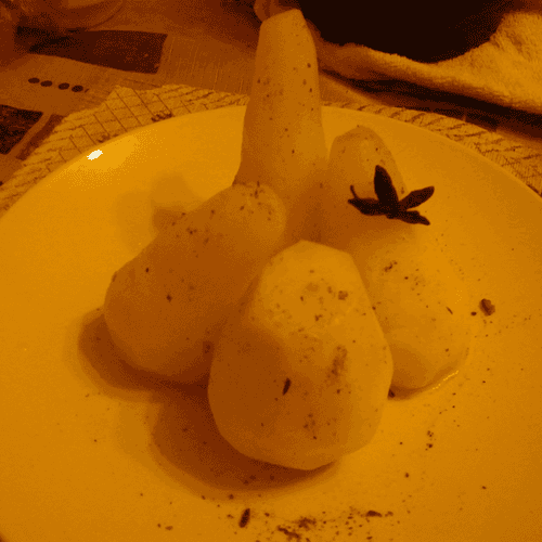 While the pears are boiling, we put star anise in a mortar and grind it, adding ginger.