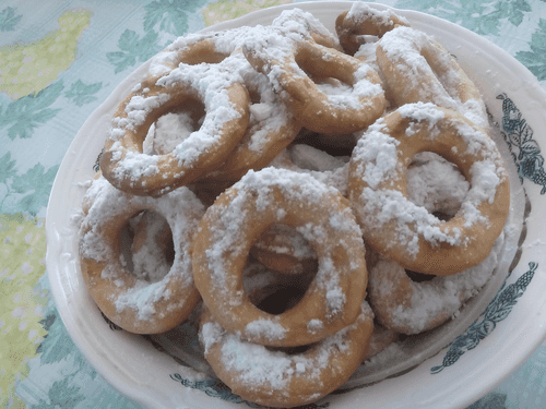 Place the donuts in hot oil and fry on both sides over medium heat. Dust the hot donuts with powdered sugar!