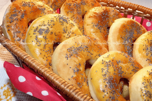 Place the bagels on a baking sheet lined with oiled paper. Let the bagels rise for about 30-40 minutes. Preheat the oven, brush the bagels with egg yolk, and sprinkle with poppy seeds. Bake at 180 degrees for about 15 minutes.