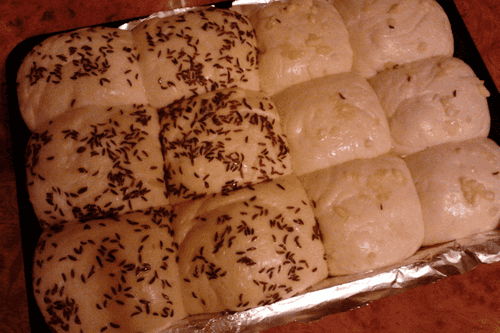 Crush the garlic, mix it with the egg white. Brush the buns and sprinkle with cumin.