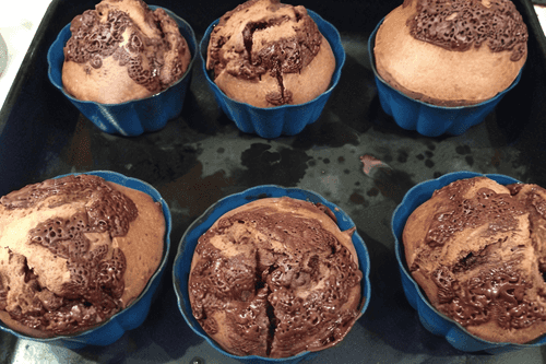 Cut the chocolate into small cubes. Add part to the dough. Leave a little for sprinkling. Distribute the dough into molds. Sprinkle with the remaining chocolate on top.