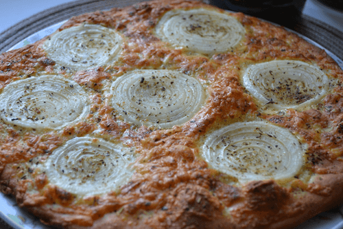 Place on a silicone mat, sprinkle with flour and roll out to a thickness of 0.5 cm. Grease with sour cream, sprinkle with grated cheese, Provencal herbs, and place onion rings. Brush each ring with olive oil and salt. Top everything with a pepper mix.