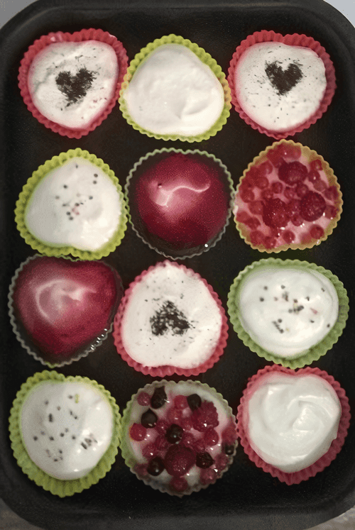 Carefully spoon the mixture into molds on top of the cookies. Place in the refrigerator for 2 hours to let the pastries set. After that, you can decorate them with sprinkles, cocoa, berries (pour a thin layer of jelly on top), or just a layer of jelly (gelatin + jam).