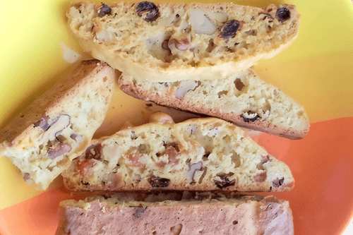 Place the slices back on the baking sheet and return to the oven. Bake the biscotti with raisins and walnuts for another 10 minutes, flipping once.