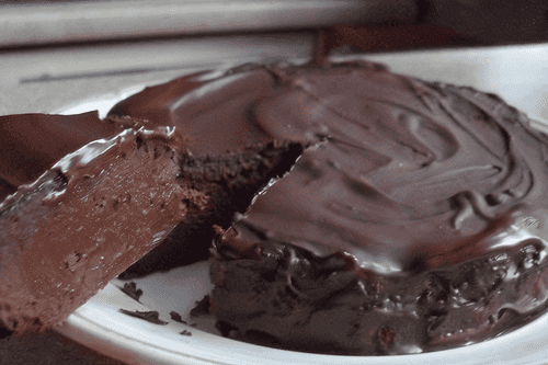 Line a 10–15 cm diameter mold with paper greased with vegetable or butter, pour in the chocolate mixture, and bake in a preheated oven for 8 minutes — no more, no less. Remove from the oven and cool for half an hour, then place in the refrigerator overnight or for 12 hours.