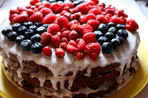 Spread half of the jam on the sponge cake, add half of the berries, and cover with 1/3 of the whipped cream.