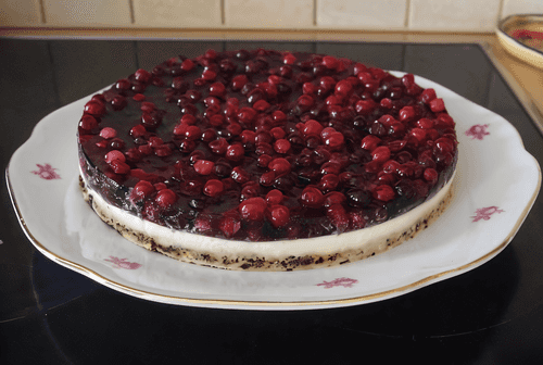 Cover the filling of the cake with berries and gently pour the mulled wine evenly on top.