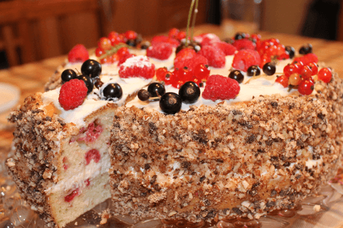 Spread the resulting cream on the layers and decorate with berries.
