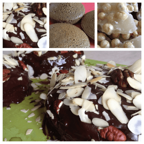 Soak the bottom layer with coffee and liqueur, then spread the cooled praline on top. Repeat with the second layer. Cover with the third layer, coat with glaze, and decorate!
