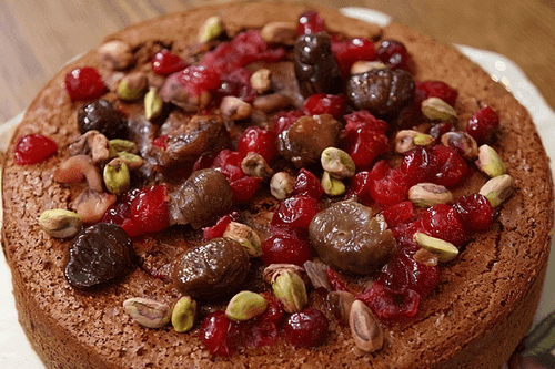 Chestnut pie with almonds, cranberries, and pistachios is a harmony of rich, warm flavors and delicate texture. It has a deep nutty aroma of chestnuts complemented by the sweetness of almonds and a slight tartness from cranberries. Orange zest adds freshness while dark chocolate provides noble richness. Historically, chestnuts were used in European cuisine as an accessible source of nutrients, especially in mountainous regions. This pie is a cozy dessert perfect for cool evenings, warming and delighting the palate. It is served with cranberry sauce creating an amazing balance of flavors. Pistachios add a pleasant crunch and complete the dish's composition. Such a pie would be a wonderful addition to family dinners or festive tables, surprising guests with its unusual combination of ingredients.