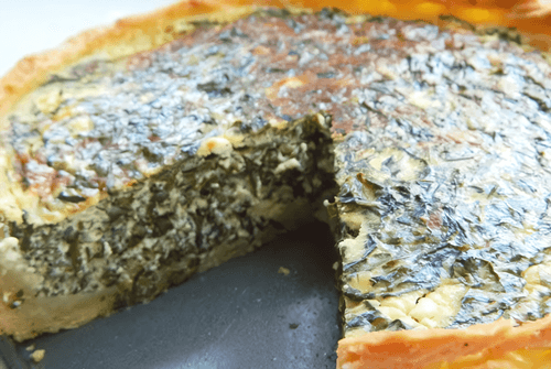 Add grated cheese, eggs, and sour cream to the cooled spinach and mix well. Pour the filling onto the dough. Bake at 150 degrees for 50 minutes. Remove from the oven and let it sit for about 30 minutes.