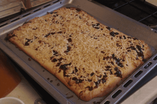 Spread any jam you like on top of the cake. Plum is best, but any other will do. Leave a little space from the edge to prevent it from spilling onto the baking tray.