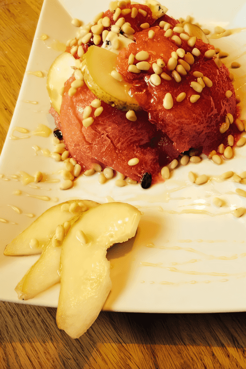 Watermelon and cheese dessert is an unusual combination of freshness and spiciness inspired by European gastronomic traditions. Bright, juicy pieces of watermelon are complemented by the creamy texture of Dorblu cheese, while pear adds a subtle fruity sweetness. Pine nuts provide a crunchy texture and nutty flavor, and honey finishes the composition with a light caramel note. This dessert is not just a treat but a true gastronomic revelation that is perfect for a summer evening or festive dinner. Its ease of preparation makes it an excellent choice for those who appreciate exquisite flavor combinations without unnecessary complexity. Try this masterpiece, and it will become your favorite sweet snack!