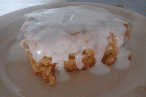 Take out the baked sponge, let it cool. Cut it lengthwise into 2 parts and spread cream on it or just pour it on top. Let it sit.