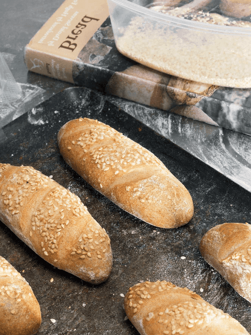 Preheat the oven to 210 degrees. Spray the baguettes with water and sprinkle with sesame seeds. Bake for fifteen to twenty minutes, and in the first five minutes, spray the oven walls with water several times.
