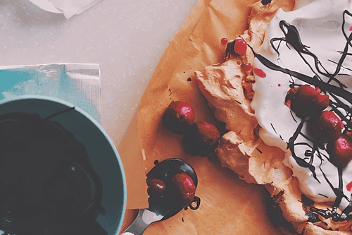 Due to the brown sugar, the meringue will acquire a beautiful cappuccino-like golden hue. Decorate the remaining meringue with cream. Generously add threads of melted chocolate (and caramel will be great here) and thawed cherry berries. Don't forget about the leftover puree, of course.