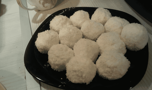 Now we roll the nut-filled balls in coconut flakes.