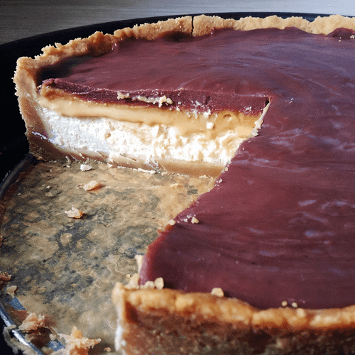 Caramel-chocolate glazed cheesecake is a harmony of delicate cheese flavor, airy texture, and the sweet charm of caramel and chocolate. This dessert has roots in European culinary traditions, where the classic cheesecake gained new dimensions through subtle sweet notes. The crunchy cookie base smoothly transitions into a silky filling enriched with sour cream and sugar. The top layer of two types of glaze—caramel and chocolate—makes it a true work of art. The cheesecake pairs perfectly with a cup of aromatic coffee or tea, turning each tasting into a celebration of flavor. It is ideal for cozy evenings and special occasions, creating an atmosphere of warmth and joy.