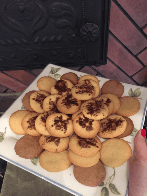 Bake for about 10 minutes until the cookies are golden brown. Then leave on the tray for a minute to let the cookies firm up a bit. Then transfer to a rack with a spatula and let cool.