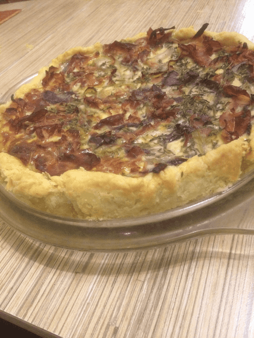 Place the onion-bacon filling on the chilled dough and pour everything with the mixture.