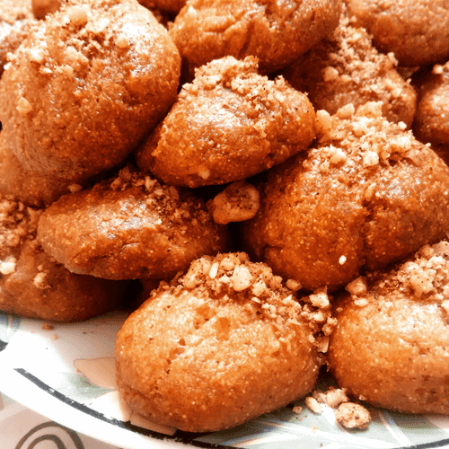 The last stage. Here there are two options. Either the syrup is hot and the cookies are cold, or the syrup is cooled and the cookies are hot. You need to 'bathe' the cookies in the syrup! Dip a few pieces in the syrup, pour well from all sides, and place on a plate. While the syrup is still fresh, sprinkle with nuts!!