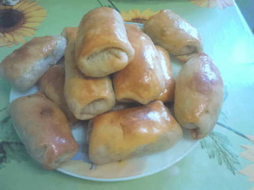 Divide the dough into pieces (do not use more flour, the dough is quite elastic and rolls out well). I divided it into 12 pieces of 45 g each. It is very convenient to roll out the dough on a rectangular board. First, roll a piece of dough into a long sausage. Then roll it thinly into a rectangle. Place about 1 tablespoon of filling at the edge. First fold the edges inward, then roll it up like a log. Do this with the remaining dough as well.
