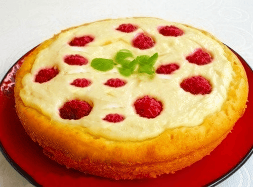 Place cherries (any berries can be used) on top of the cottage cheese filling and put it in a cold oven, then set the temperature to 180 degrees and bake the pie for 35-40 minutes.