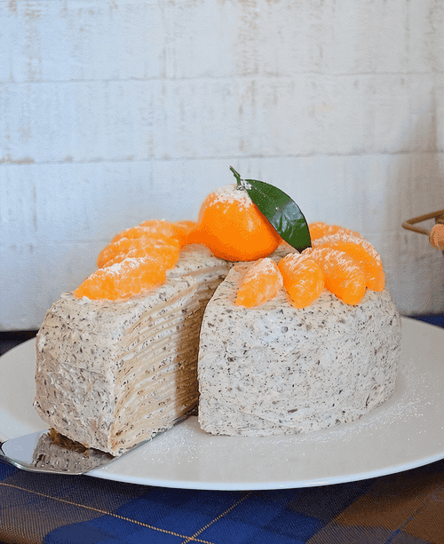 Assemble the cake: layer pancakes on a plate, spreading prepared cream on each. The height of the cake can be adjusted as desired, using as many pancakes as needed. Cover the top with cream as well.