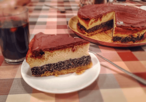 Poppy-cottage cheese pie is an exquisite dessert that combines the tenderness of the cottage cheese layer with the rich flavor of poppy seeds. Poppy seeds, long used in European cuisine, give the pie a subtle nutty aroma and a light texture that harmonizes with the airy cottage cheese layer. Apples add freshness, while condensed milk provides pleasant sweetness. This pie is perfect for a cozy tea time or festive table, impressing with its multilayered structure and rich taste. The pleasant acidity of the cottage cheese and the sweetness of the poppy create a balance of flavors, making each piece truly delightful. It is served chilled, which further reveals its rich flavor.