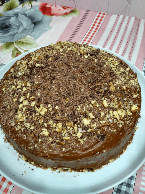 Spread cream on the layers. Coat the top and sides. Decorate as you wish. I sprinkled the sides with walnuts. Store the cake in the fridge, take it out an hour before serving.