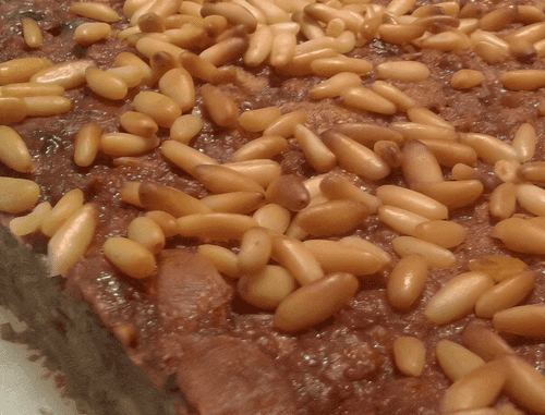 Evenly distribute the mass in the shape and sprinkle pine nuts on top, gently pressing them into the surface.