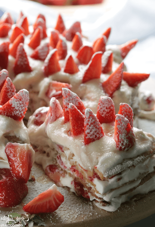 Decorate the last layer of whipped cream with strawberry slices and sprinkle with powdered sugar.