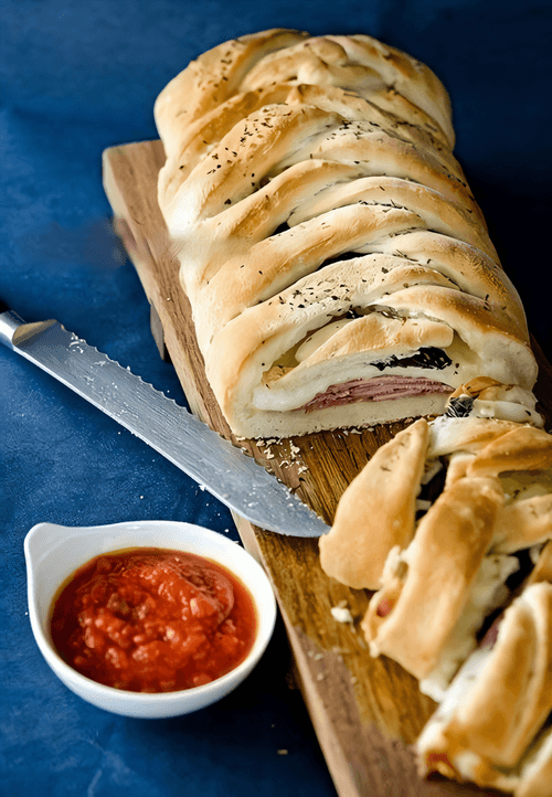 Stromboli is a delicious Italian roll inspired by traditional pizza. Its history began in the 1950s in the USA, where Italian immigrants created this portable pizza variant. The crispy dough wraps around spicy ham, flavorful salami, and zesty pepperoni, complemented by melted mozzarella and rich hard cheese. Fresh basil adds an Italian touch to the dish. Baked to a golden crust, stromboli absorbs the aromas of oregano and olive oil, creating a perfect balance of flavors. It's great for a cozy dinner, a friendly gathering, or a quick snack. Served with marinara sauce that adds sweet and sour notes, making each bite even richer. Stromboli is a gastronomic journey to Italy wrapped in a roll!
