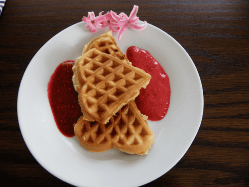 Waffles can be served hot, warm, or cold. The plate can be decorated with two sauces: rich raspberry and delicate cream, or you can dip the waffles in the sauce so that one side is completely covered (for example, using a fork).