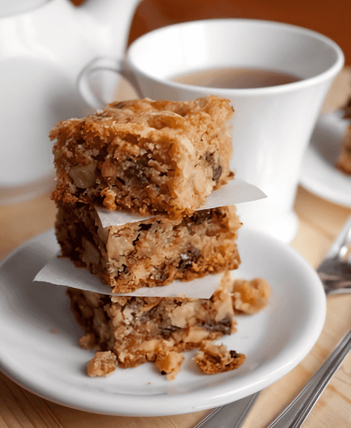 Blondies with walnuts, white and dark chocolate are an elegant treat with a rich flavor and delicate texture. The origin of this dessert is linked to the classic American blondie, which is a variation of brownie but without cocoa. Here, the caramel notes of brown sugar harmoniously blend with the rich bitterness of dark chocolate, creamy sweetness of white chocolate, and crunchy walnuts. This dessert is perfect for cozy evenings with a cup of coffee or tea and makes an excellent addition to festive tables. Its simplicity in preparation makes it accessible even for baking novices. Serve it in portioned squares, enjoying each bite filled with a variety of flavors and textures.