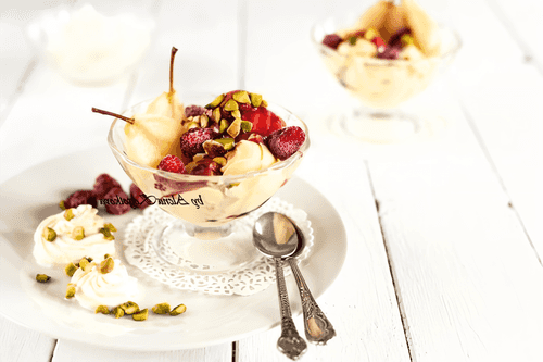 Serving: place ice cream in a bowl, next to it two halves of a pear. Drizzle with raspberry sauce and sprinkle with pistachios.