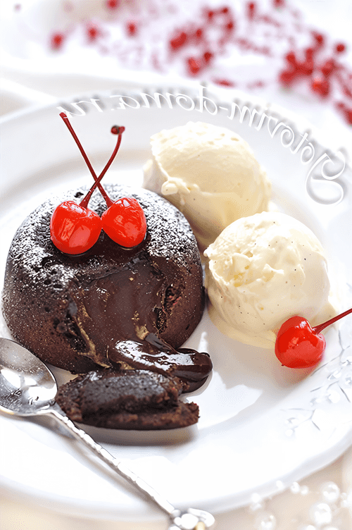 Remove the fondant from the oven and let it sit in the molds for about 3-5 minutes. Cover the mold with a plate and carefully flip the fondant onto the plate. The fondant can be served with ice cream.