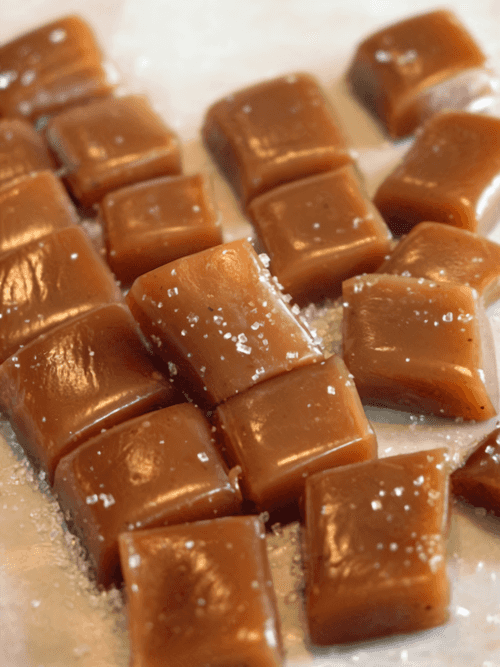 After about 3 hours, the caramel should be placed in the fridge. It will set completely. After that, simply cut the caramel into candies with a wet knife. If it has hardened too much, heat the knife in boiling water, but not too much. The candies can be sprinkled with powdered sugar, almond flour, or salt — this is trendy now and delicious. I made the basic version for the first time.