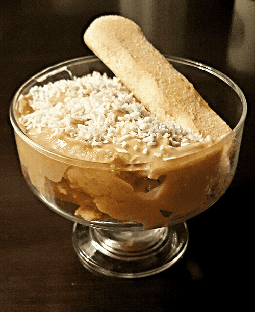 Banana custard dessert is a refined combination of delicate custard and rich banana flavor. This dessert has its roots in European cuisine, where the subtle textures and natural sweetness of ingredients are appreciated. The cream made from milk, egg yolks, sugar, and vanilla is complemented by airy puree of ripe bananas, creating a velvety consistency with a light fruity aroma. Layers of fragile savoiardi cookies are soaked in this delightful cream, forming a harmonious blend of textures. After cooling, the dessert acquires an amazing softness and rich taste, while the finishing touch of coconut flakes adds an exquisite aroma. It is served as a refined treat with tea or coffee, enjoying each spoonful that transports you to a warm homey atmosphere.